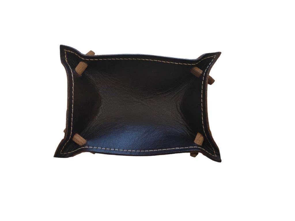 Vacíabolsillos rectangular elaborado en cuero marrón con costuras. Este vacíabolsillos es perfecto para depositar todo lo que llevamos en los bolsillos, cartera, llaves, monedas… al llegar a casa y tenerlo organizado en un mismo lugar.