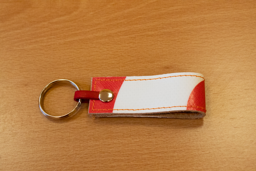 Llavero de la marca DLONAS, elaborado a partir de lonas publicitarias recicladas por personas con discapacidad intelectual de los talleres de la Fundación Adcor.