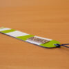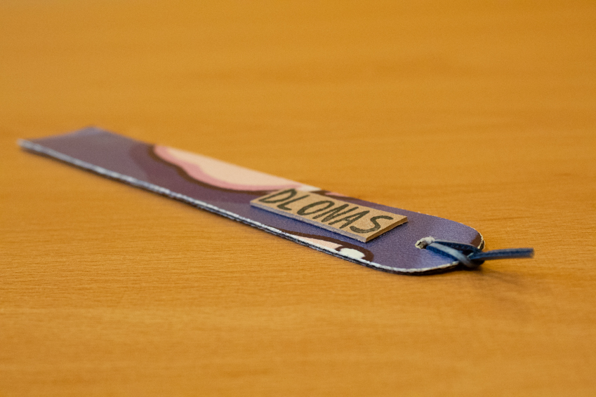 Marcapáginas de la marca DLONAS, elaborado a partir de lonas publicitarias recicladas por personas con discapacidad intelectual de los talleres de la Fundación Adcor.